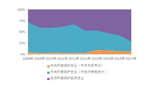 2012年之前,中央環(huán)境保護(hù)支出(中央本級(jí)支出+對(duì)地方轉(zhuǎn)移支付)與地方環(huán)境保護(hù)實(shí)際支出所占比例呈現(xiàn)穩(wěn)定狀態(tài)。從2013年開(kāi)始,兩者對(duì)比發(fā)生較大變化,中央環(huán)境保護(hù)預(yù)算支出占比急劇下降,而地方預(yù)算支出急劇上升。