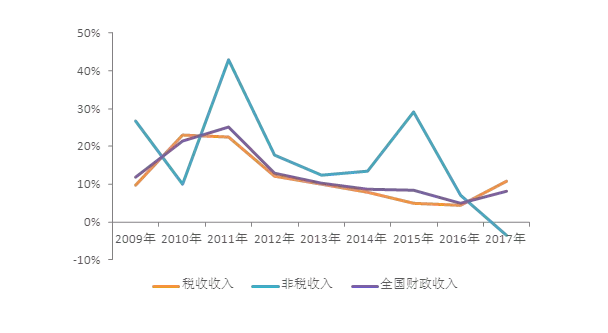 除此之外,全國(guó)歷年公共預(yù)算收入增長(zhǎng)速度與稅收收入增長(zhǎng)速度呈完全正相關(guān)關(guān)系,而非稅收入增長(zhǎng)幅度的劇烈波動(dòng)則會(huì)使得這種正相關(guān)關(guān)系發(fā)生一定程度的偏離。2009年至2011年期間,全國(guó)公共預(yù)算收入增長(zhǎng)幅度持續(xù)升高;從2012年開(kāi)始,稅收收入增長(zhǎng)幅度不斷下降并持續(xù)至2016年,2017年開(kāi)始回穩(wěn);2017年非稅收入的負(fù)增長(zhǎng)使得當(dāng)年全國(guó)公共預(yù)算收入增幅低于稅收收入增幅。