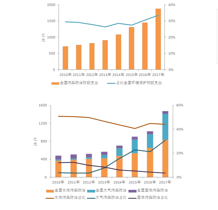 近兩年,全國(guó)污染防治公共預(yù)算支出占比全國(guó)環(huán)境保護(hù)公共預(yù)算支出在小幅提升。與水污染防治、大氣污染防治相比,全國(guó)固體廢物污染防治支出呈逐年持續(xù)下降趨勢(shì);從2013年開(kāi)始,大氣污染防治財(cái)政支出占比呈現(xiàn)劇烈增加;而水體污染防治支出從2010年-2015年不斷下降,受水十條等政策影響,2016年-2017年水污染防治財(cái)政支出占比逐漸回升。