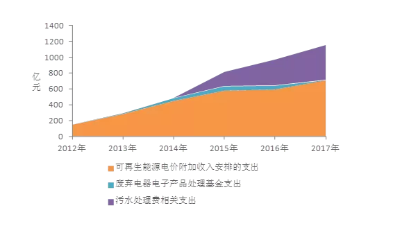 從2012年至2015年,可再生能源支出攀升速度較快,而從2015年至2017年每年該項(xiàng)支出逐漸穩(wěn)定。廢棄電器電子產(chǎn)品支出從2012年至2015年穩(wěn)步提高,而從2016年開(kāi)始逐漸下降,2017年更是迅速衰減。而全國(guó)污水處理費(fèi)從2015年明確列支開(kāi)始,即呈現(xiàn)穩(wěn)步增加趨勢(shì)。