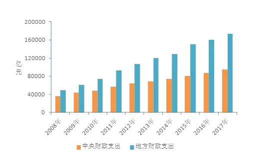 一般公共預(yù)算支出從兩個(gè)層面展開(kāi),中央一般公共預(yù)算支出、地方一般公共預(yù)算支出。2008年至2017年,中央公共預(yù)算支出增加1.6倍、地方公共預(yù)算支出增加2.5倍。