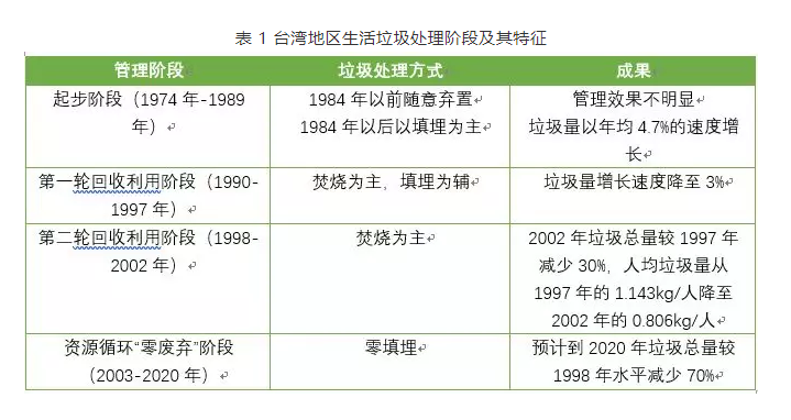 臺(tái)北是臺(tái)灣省的六個(gè)“直轄市”之一,也是臺(tái)灣省的政治、經(jīng)濟(jì)、文化、旅游、工業(yè)、商業(yè)與傳播中心,人口密度居臺(tái)灣第二位。臺(tái)北地少人多,大量生活垃圾的處理問(wèn)題曾一度困擾臺(tái)北市政府。為了從源頭上降低垃圾產(chǎn)生量,減輕環(huán)境負(fù)荷,臺(tái)北市從20世紀(jì)80年代開(kāi)始,耗時(shí)近30年分階段采取不同措施(如表 1),綜合運(yùn)用法律手段和經(jīng)濟(jì)手段,實(shí)現(xiàn)了垃圾減量化和資源化的目標(biāo)。