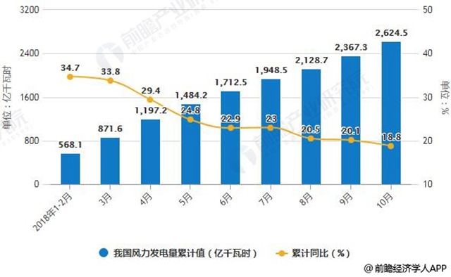 2018年1-10月我國風力發(fā)電量統(tǒng)計及增長情況