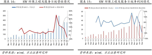 2018年二季度行業(yè)整體業(yè)績(jī)開始下滑?;仡?018年單季度業(yè)績(jī)情況,2018年一、二、三季度行業(yè)收入增速分別為101.35%、77.88%和-28.13%,扣非后凈利潤(rùn)增速分別為107.23%、36.42%和-43.96%,可見2018年第二季度行業(yè)整體業(yè)績(jī)?cè)鏊匍_始下滑,第三季度行業(yè)整體業(yè)績(jī)開始負(fù)增長(zhǎng)。這與4月份以來(lái)PPP政策收緊、民企信用利差擴(kuò)大的環(huán)境變化一致。