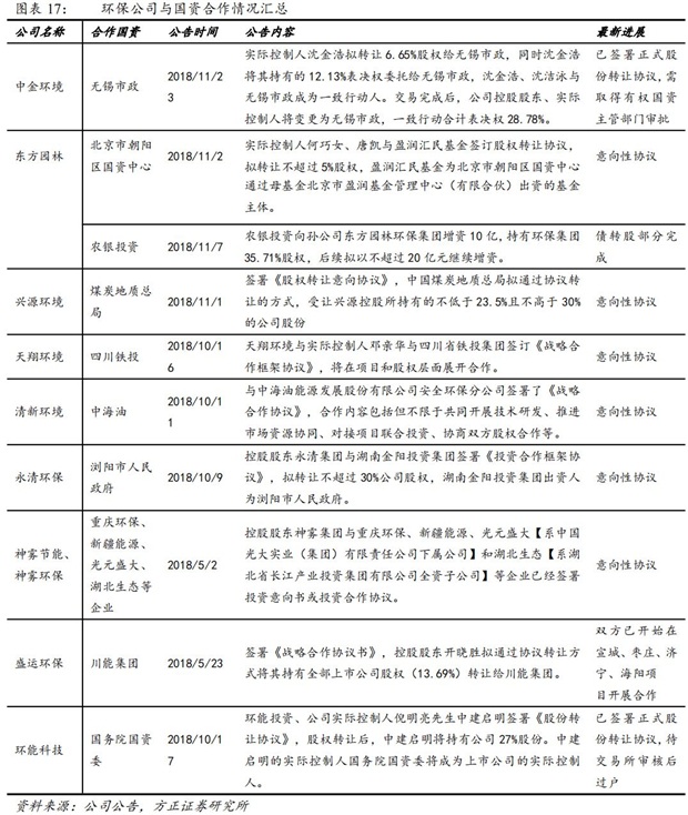 2018年5月至今,環(huán)保板塊已有神霧環(huán)保、盛運(yùn)環(huán)保、東方園林、環(huán)能科技、中金環(huán)境等民營(yíng)企業(yè)公告將通過引入國(guó)企或政府資金作為戰(zhàn)略投資人或者出讓控股權(quán)保障企業(yè)持續(xù)經(jīng)營(yíng)。