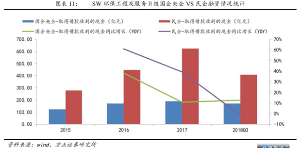2018年民企融資陷入冰點(diǎn)。我們統(tǒng)計(jì)了SW環(huán)保工程及服務(wù)Ⅱ級(jí)公司的銀行借款情況,2018年前三季度國(guó)企和央企借款取得的現(xiàn)金規(guī)模171億元,同比增長(zhǎng)13%;民營(yíng)企業(yè)借款取得的現(xiàn)金規(guī)模407億元,同比下降2%??梢?,2018年國(guó)有企業(yè)從銀行借款未受到影響,但民營(yíng)企業(yè)從銀行借款取得的現(xiàn)金規(guī)模明顯縮小。