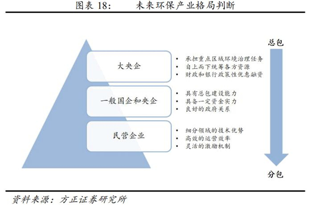 我們認(rèn)為環(huán)保產(chǎn)業(yè)將放棄之前的粗放式發(fā)展,進(jìn)入追求高質(zhì)量發(fā)展的階段。經(jīng)過2-3年的格局重塑,我們認(rèn)為未來(lái)行業(yè)格局將形成國(guó)企央企主導(dǎo)投資、民企專注細(xì)分市場(chǎng)技術(shù)的新格局。
