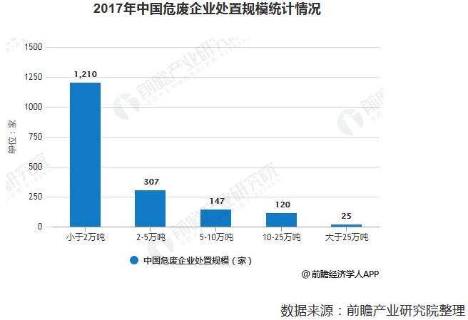 正因此,我國危廢處理行業(yè)參與者較多,但企業(yè)規(guī)模普遍較小。根據(jù)2017年7月的數(shù)據(jù)統(tǒng)計,我國危廢處理企業(yè)產(chǎn)能低于2萬噸、2-5萬噸、5-10萬噸、10-25萬噸和25萬噸以上的企業(yè)數(shù)量分別為1210家、307家、147家、120家和25家,67%的企業(yè)危廢處理產(chǎn)能低于2萬噸。