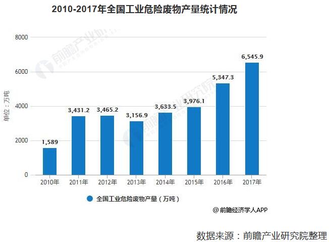 近年來,隨著我國經(jīng)濟總量不斷擴大,工業(yè)危險廢物產(chǎn)量也出現(xiàn)明顯增加。2010年全國工業(yè)危險廢物產(chǎn)量已達(dá)1589萬噸,2012年全國工業(yè)危險廢物產(chǎn)量增長至3465.2萬噸,2013年有所下降,之后繼續(xù)增長,到了2016年全國工業(yè)危險廢物產(chǎn)量達(dá)到5347.3萬噸,較上年同比增長34.49%。截止到2017年全國工業(yè)危險廢物產(chǎn)量達(dá)到突破6500萬噸。但有效處理量不足,危險廢物處理水平有待提高。