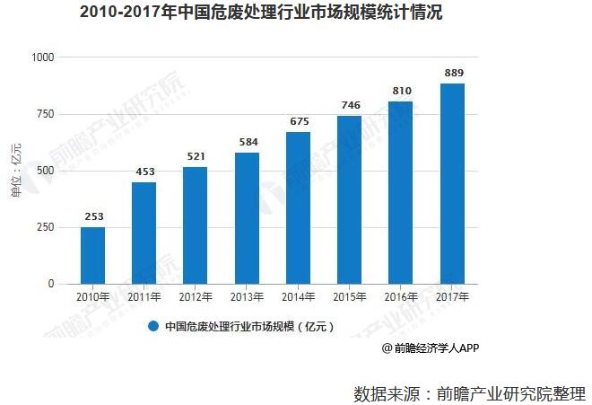 我國危廢處理行業(yè)自2001年左右起步,經(jīng)過十多年的發(fā)展,行業(yè)進入快速增長階段,但也存在經(jīng)驗和技術(shù)上的短板。由于我國危廢整體處置率較低,使得行業(yè)市場規(guī)模較小。據(jù)前瞻產(chǎn)業(yè)研究院發(fā)布的《中國危廢處理行業(yè)市場前瞻與投資戰(zhàn)略規(guī)劃分析報告》統(tǒng)計數(shù)據(jù)顯示,2010年中國危廢處理行業(yè)市場規(guī)模僅僅為253億元,2011年中國危廢處理行業(yè)市場規(guī)模增長至453億元。之后一直保持平穩(wěn)增長,到了2016年中國危廢處理行業(yè)市場規(guī)模突破800億元,截止到2017年中國危廢處理行業(yè)市場規(guī)模達(dá)到了約889億元。