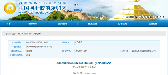 2018年12月26日,河北省蔚縣環(huán)保能源熱電項目(PPP)發(fā)布中標公告,中國環(huán)境保護集團有限公司成為中標的社會資本方,中標金額為74.1元/噸。