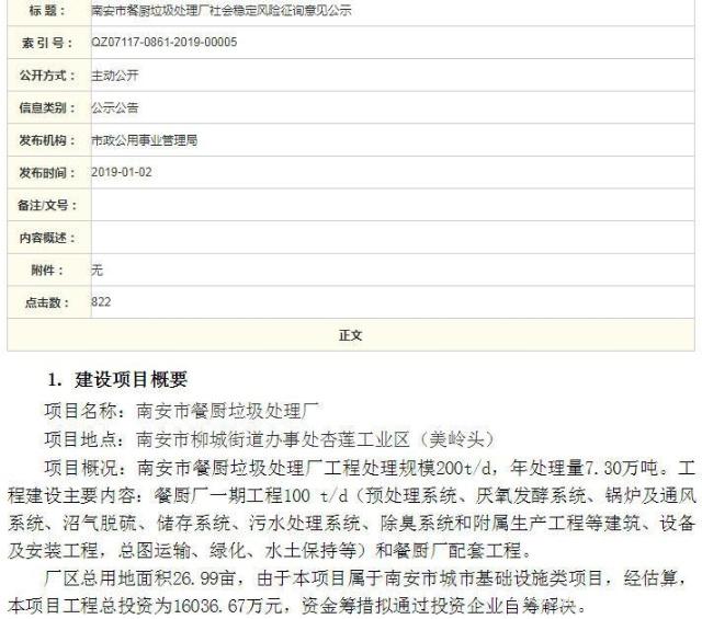2019年1月2日,南安市政公用事業(yè)管理局發(fā)布兩份《社會(huì)穩(wěn)定風(fēng)險(xiǎn)征詢意見公示》,主要內(nèi)容關(guān)于南安市生活垃圾焚燒發(fā)電廠提級(jí)改造,以及南安市餐廚垃圾處理廠建設(shè)兩項(xiàng)工程。具體如下: