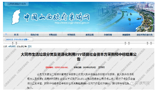 大同市生活垃圾分類資源化利用PPP項目預中標公示: