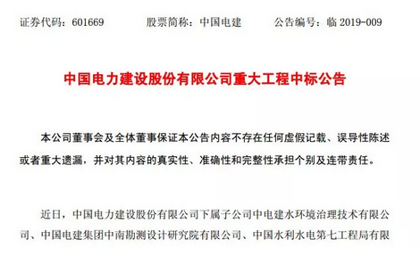 2019年1月24日,中國電建發(fā)布公告表示,中國電建水環(huán)境治理技術(shù)有限公司中標(biāo)了2019年龍崗區(qū)龍崗河流域、觀瀾河流域消除黑臭及河流水質(zhì)保障工程項(xiàng)目,中標(biāo)金額約為97.31億元人民幣,項(xiàng)目總工期為334天。