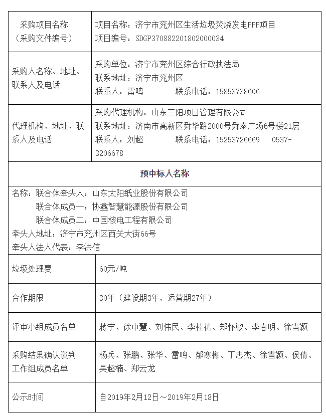 2019年春節(jié)過后,開工的第二天,2月12日,從濟(jì)寧公共資源交易網(wǎng)獲悉,山東濟(jì)寧市兗州區(qū)生活垃圾焚燒發(fā)電PPP項(xiàng)目預(yù)中標(biāo)結(jié)果公示,山東太陽紙業(yè)股份有限公司牽頭的,協(xié)鑫智慧能源股份有限公司與中國核電工程有限公司組成的聯(lián)合體中標(biāo),垃圾處理費(fèi)60元/噸。