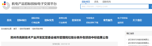 鄭州市高新技術(shù)產(chǎn)業(yè)開(kāi)發(fā)區(qū)管委會(huì)城市管理局垃圾分類(lèi)外包項(xiàng)目發(fā)布中標(biāo)結(jié)果公告,浙江聯(lián)運(yùn)環(huán)境工程股份有限公司獲得第四標(biāo)段。