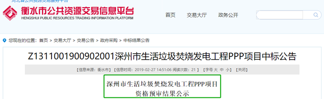 2019年2月27日,河北省深州市生活垃圾焚燒發(fā)電工程PPP項目發(fā)布資格預(yù)審結(jié)果公告。