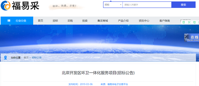 福建省北岸開發(fā)區(qū)環(huán)衛(wèi)一體化服務項目發(fā)布招標公告。