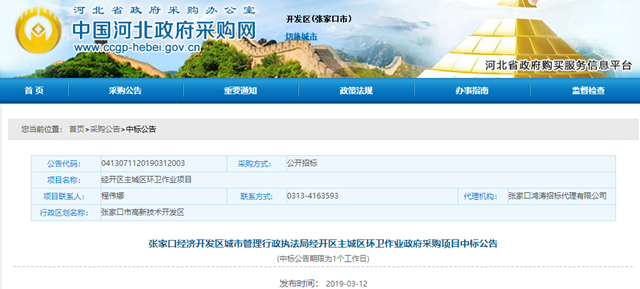 原標(biāo)題:北京環(huán)境中標(biāo)1.06億張家口經(jīng)開區(qū)主城區(qū)環(huán)衛(wèi)作業(yè)政府采購(gòu)項(xiàng)目