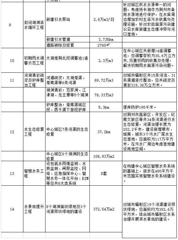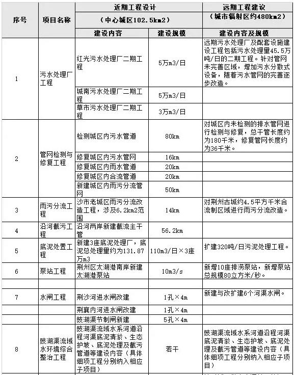 本項(xiàng)目考慮對(duì)近期中心城區(qū)102.5 km2 范圍予以治理,建設(shè)內(nèi)容包含沙市老城區(qū)雨污分流改造工程、沿河截污工程、中心城區(qū)管網(wǎng)檢測(cè)與修復(fù)工程、城市初期雨水調(diào)蓄及面源治理示范工程、河湖疏浚清淤及底泥處置、城區(qū)河道護(hù)岸整治、封閉湖淵活水工程、濱水景觀提升工程、中心城區(qū)智慧水務(wù)系統(tǒng)工程、中心城區(qū)水閘工程、中心城區(qū)排澇工程、河道生態(tài)修復(fù)工程、污水廠擴(kuò)建工程、豉湖渠流域水環(huán)境綜合整治工程等。