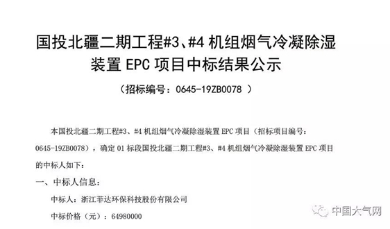 浙江菲達環(huán)??萍脊煞萦邢薰局袠藝侗苯诠こ?3、#4機組煙氣冷凝除濕裝置EPC項目,中標價格為64980000元。