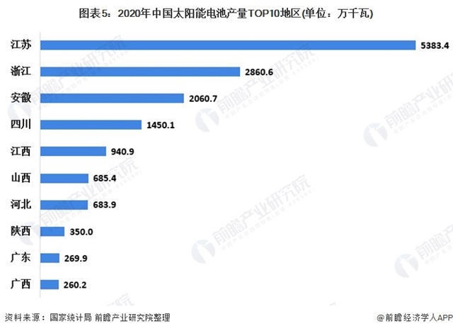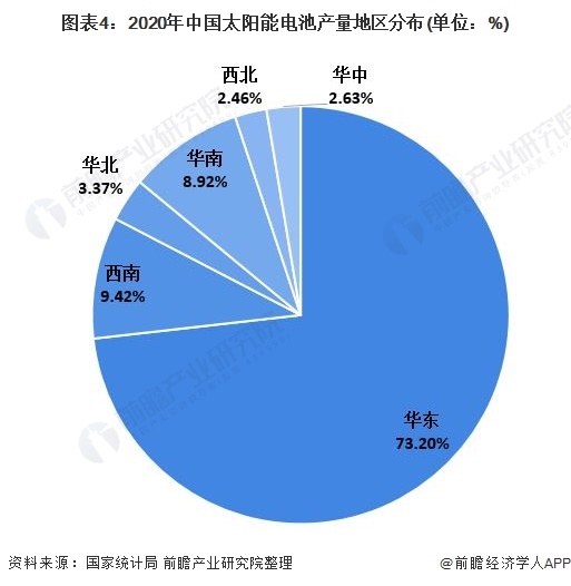 2020年,在我國太陽能電池的生產(chǎn)地區(qū)中,華東地區(qū)電池產(chǎn)量最多,占全國產(chǎn)量的73.2%;西南地區(qū)產(chǎn)量排在第二位,電池產(chǎn)量占比為7.42%。
