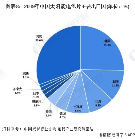 從出口國分布來看,2019年我國電池片出口國出口額排名第一的是韓國,占比為25.3%;越南排名第二,占比為11.8%;印度排名第三,占比為9.5%。2019年前十大出口國合計占比69.4%,比2018年同期的51.2%大幅提高18.2個百分點,海外產(chǎn)能進一步集中。