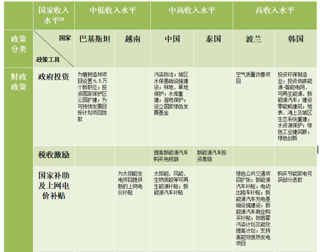 總結而言,中等偏下收入的國家更多地依賴生態(tài)環(huán)保相關項目來帶動就業(yè)。而中等偏上收入和高收入國家將財政政策輻射到更多領域(如新能源汽車、建筑節(jié)能、能效)且利用了更豐富的政策工具(如財政政策上的稅收優(yōu)惠、補貼,配套的貨幣政策等)。