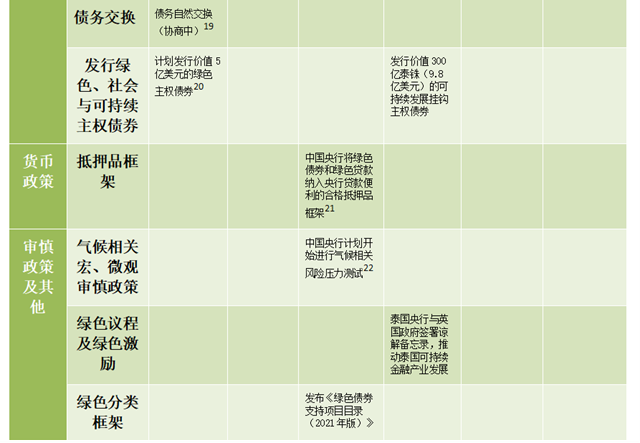 兩個中等偏上收入的國家,在生態(tài)基礎設施和污染治理的基礎上,將財政刺激更多地傾斜于可再生能源發(fā)展和新能源車補貼。對新能源汽車行業(yè)的支持同時也包括了在購買、生產和投資方面的稅收優(yōu)惠。在貨幣政策和金融監(jiān)管方面,中國央行將綠色債券和綠色貸款納入央行貸款便利的合格抵押品框架,計劃開始進行氣候風險壓力測試,同時發(fā)布了《綠色債券支持項目目錄(2021年版)》對綠色債券市場進行了進一步規(guī)范和指導。