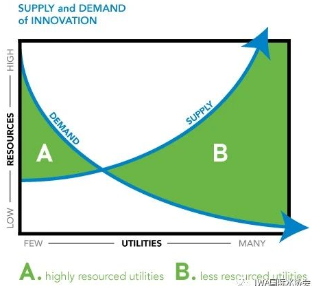 美國DC Water的前任CEO,George Hawkins對創(chuàng)新的理解非常深刻,也是帶領(lǐng)DC Water完成一系列創(chuàng)新變革成為備受尊重全球領(lǐng)先水務(wù)公司的領(lǐng)導(dǎo)者。George在2017年給出了上面的圖,其X軸代表的是水務(wù)公司的數(shù)量,由左至右增加。左側(cè)的縱軸代表一個水務(wù)公司的資源大小(包括了財力、人力、技術(shù)儲備、研發(fā)能力等)。右側(cè)的縱軸來表示,越上方的創(chuàng)新的潛在價值越高。從這張圖,我們可以看出: