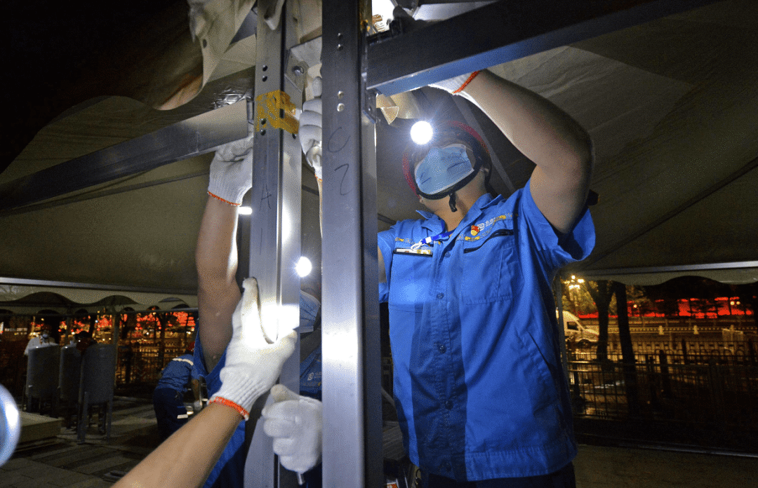 “這個位置的帳篷式廁所我們是第一次搭建,的確是個不小的挑戰(zhàn)。”董建剛說, “因為70年大慶的時候,這個位置放的是移動式的拖掛廁所,但我們發(fā)現(xiàn)移動公廁在使用時,人需要上幾級臺階才能進(jìn)入廁所,一出一進(jìn)就增加了排隊的時間,所以這次我們選擇把東北角的拖掛式廁所換成帳篷式的,可以減少等候時間?!倍▌傉f。