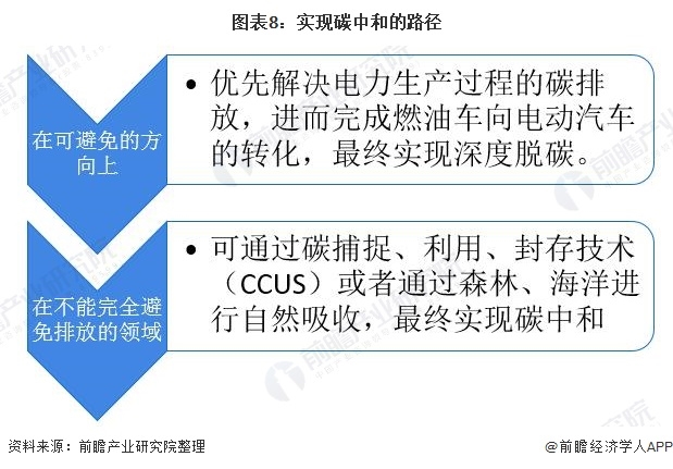在可避免的方向上,國(guó)家提出優(yōu)先解決電力生產(chǎn)過(guò)程的碳排放,進(jìn)而完成燃油車向電動(dòng)汽車的轉(zhuǎn)化,最終實(shí)現(xiàn)深度脫碳。在不能完全避免排放的領(lǐng)域,可通過(guò)碳捕捉、利用、封存技術(shù)(CCUS)或者通過(guò)森林、海洋進(jìn)行自然吸收,最終實(shí)現(xiàn)碳中和。