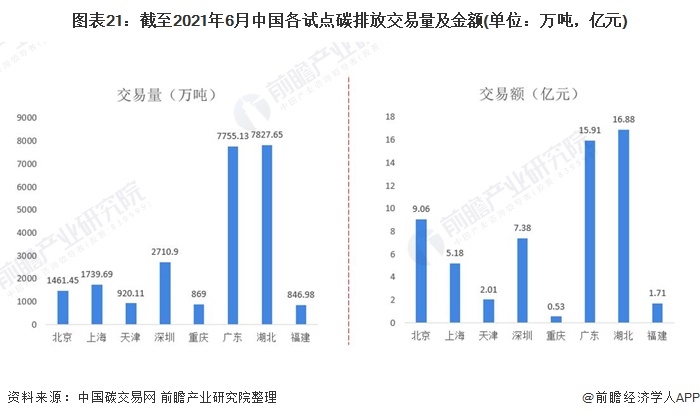 從各個(gè)試點(diǎn)地區(qū)的交易情況來(lái)看,湖北省和廣東省的碳交易中心的市場(chǎng)規(guī)模要遠(yuǎn)超于其他地區(qū),其中湖北省的碳交易總量和碳交易總額都位列首位,分別為7827.65萬(wàn)噸和16.88億元。在北京、上海、天津、深圳和重慶五個(gè)市內(nèi),北京和深圳的碳交易相對(duì)活躍,其中北京的碳交易額總共為9.06億元,深圳的碳交易總額共7.38億元。