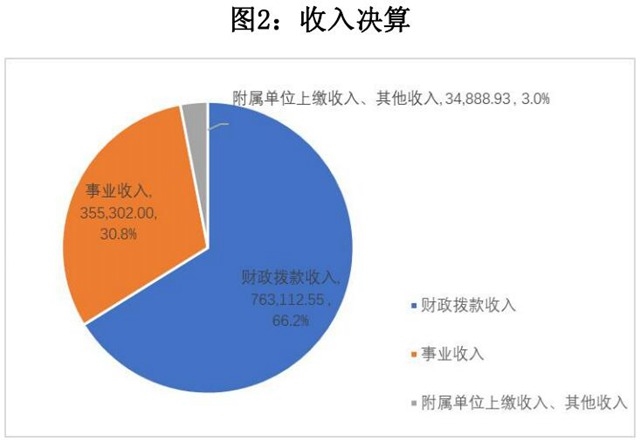 本年收入合計(jì)1,153,303.49萬(wàn)元,其中:財(cái)政撥款收入 763,112.55萬(wàn)元,占66.2%;事業(yè)收入355,302萬(wàn)元,占30.8%;附 屬單位上繳收入130萬(wàn)元,其他收入34,758.93萬(wàn)元,兩項(xiàng)合計(jì)占 3%。