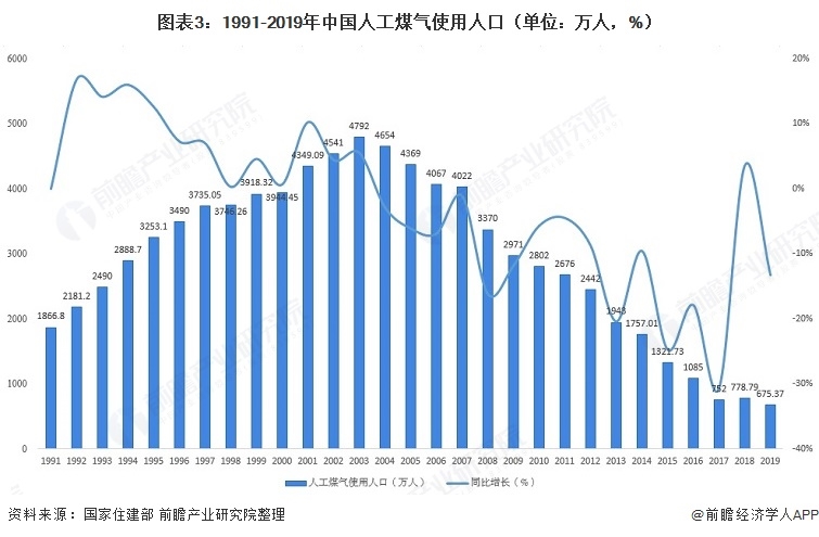 人工煤氣供應(yīng)量經(jīng)過上世紀(jì)90年代的大幅增長后,由于其污染較大、毒性較強(qiáng)等缺點,進(jìn)入21世紀(jì)后使用量逐年減少。根據(jù)住建部數(shù)據(jù)顯示,1991-2003年,我國使用人工煤氣人數(shù)不斷增加,2003年使用人數(shù)達(dá)到巔峰為4792萬人,隨后開始逐步下降,2019年我國使用人工煤氣人數(shù)為675.37萬人。