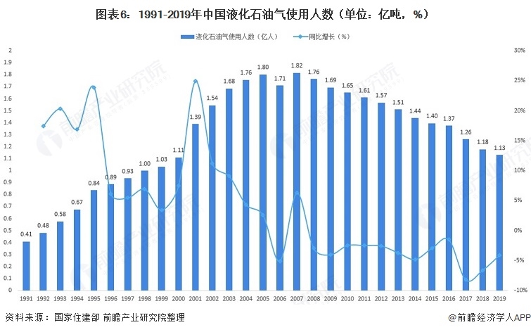 上世紀(jì)90年代以來,我國液化石油氣使用人數(shù)不斷增加,1991年使用液化石油氣人數(shù)僅為0.41億人,2007年見頂達(dá)到1.82億人,之后則不斷下降,2019年使用液化石油氣人數(shù)為1.13億人。