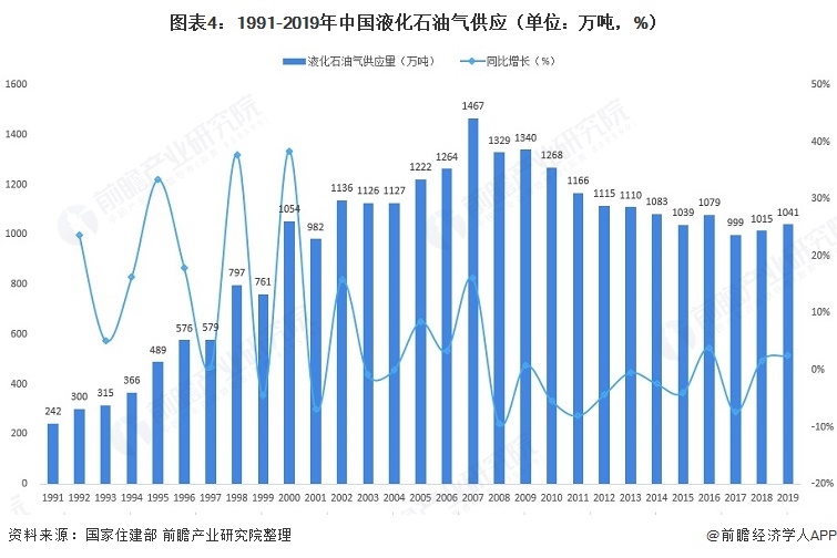 液化石油氣是在煉油廠內(nèi),由天然氣或者石油進(jìn)行加壓降溫液化所得到的一種無色揮發(fā)性液體。它極易自燃,當(dāng)其在空氣中的含量達(dá)到了一定的濃度范圍后,它遇到明火就能爆炸。國家住建部數(shù)據(jù)顯示,1991-2007年我國液化石油氣供應(yīng)經(jīng)歷了穩(wěn)定增長,由1991年供應(yīng)量242萬噸增加至2007年的1467萬噸,并達(dá)到最大,2007年以后我國液化石油氣供應(yīng)開始下降,但下降趨勢在2016年終止,近幾年液化石油氣受到石油價格上漲的影響,供應(yīng)量維持穩(wěn)定,2019年我國液化石油氣供應(yīng)1041萬噸。