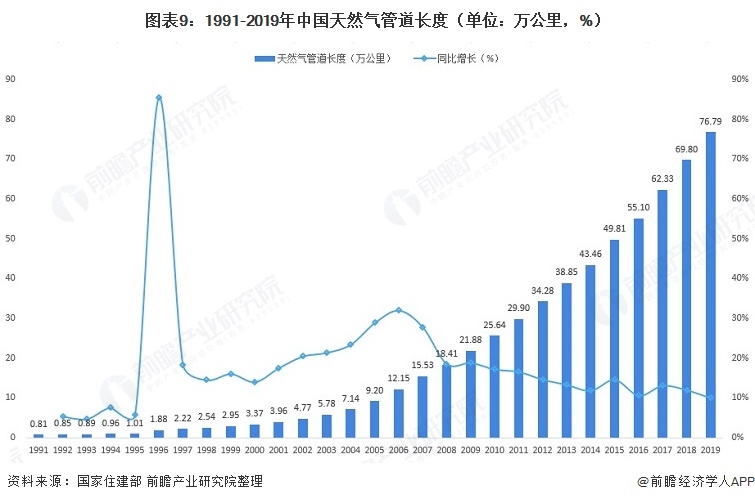 天然氣是優(yōu)質(zhì)高效、綠色清潔的低碳能源。加快天然氣開發(fā)利用,促進(jìn)協(xié)調(diào)穩(wěn)定發(fā)展,是我國推進(jìn)能源生產(chǎn)和消費革命,構(gòu)建清潔低碳、安全高效的現(xiàn)代能源體系的重要路徑。1991-2019年我國天然氣管道長度逐年上升,1991年我國天然氣管道長度僅為0.81萬公里,而2019年則達(dá)到76.79萬公里。經(jīng)過前期快速發(fā)展,后期增速逐步放緩,2019年增速為10%。