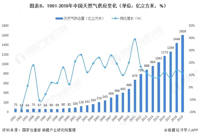 由于天然氣的以上特點,住建部數(shù)據(jù)顯示,1991-2019年我國天然氣供應(yīng)量不斷增加,由最初1991年供應(yīng)量僅為75億立方米快速上漲至2019年的1609億立方米,2019年天然氣供應(yīng)是1991年的21倍多。