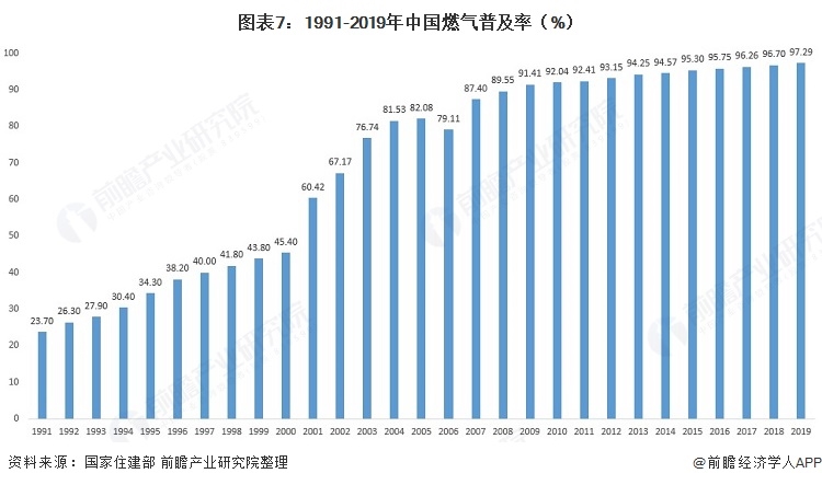 城市燃?xì)馄占奥?城市建成區(qū)使用燃?xì)馊藬?shù)/城市建成區(qū)人口×100%,城鎮(zhèn)燃?xì)庾鳛槌擎?zhèn)基礎(chǔ)設(shè)施建設(shè)的重要組成部分,在提升市民的生活質(zhì)量、改善自然環(huán)境和社會環(huán)境、推動經(jīng)濟(jì)和社會的可持續(xù)發(fā)展等方面發(fā)揮著越來越重要的作用。自1991年以來我國城市燃?xì)馄占奥史€(wěn)步上升,2019年已經(jīng)達(dá)到97.29%。