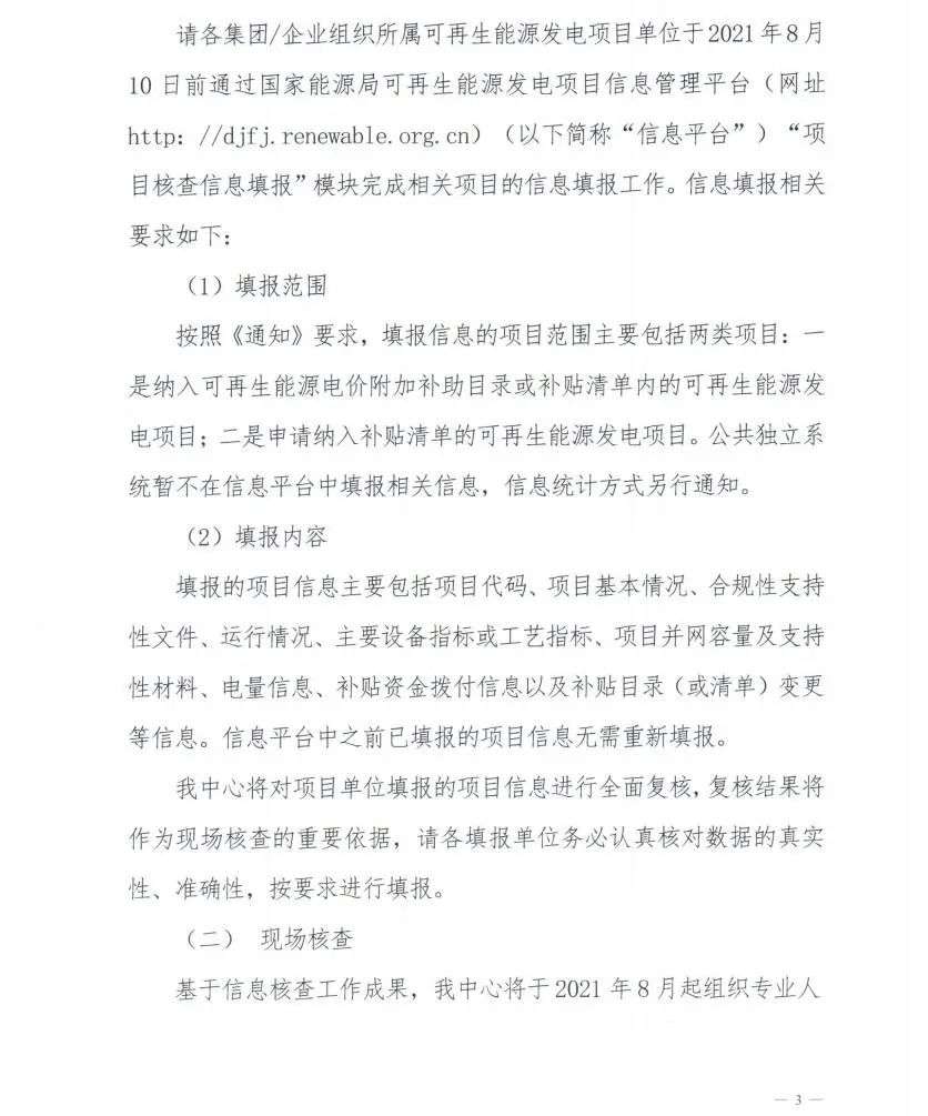 國家可再生能源信息管理中心要求各集團(tuán)/企業(yè)組織所屬可再生能源發(fā)電項(xiàng)目單位于2021年8月10日前通過信息平臺“項(xiàng)目核查信息填報(bào)”模塊完成相關(guān)項(xiàng)目的信息填報(bào)工作。