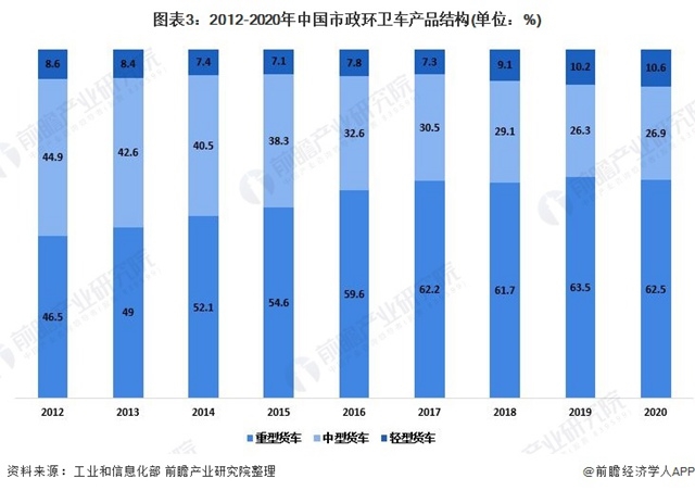從車型結(jié)構(gòu)來看,重型產(chǎn)品的比重已經(jīng)從2012年的46.5%增長到2020年的62.5%。從近幾年的產(chǎn)品結(jié)構(gòu)趨勢來看,市政環(huán)衛(wèi)產(chǎn)品重型化趨勢十分明顯,重型產(chǎn)品的比重不斷提升,中型產(chǎn)品市場份額受到擠壓,同時輕型產(chǎn)品份額也有所提升,產(chǎn)品呈現(xiàn)出向重型、輕型兩極發(fā)展的趨勢。