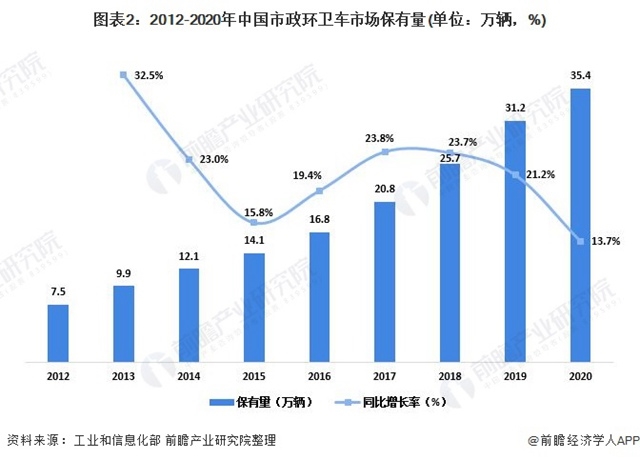 截至2020年底,我國市政環(huán)衛(wèi)車市場保有量累計達(dá)到35.4萬輛,同比增長13.7%。