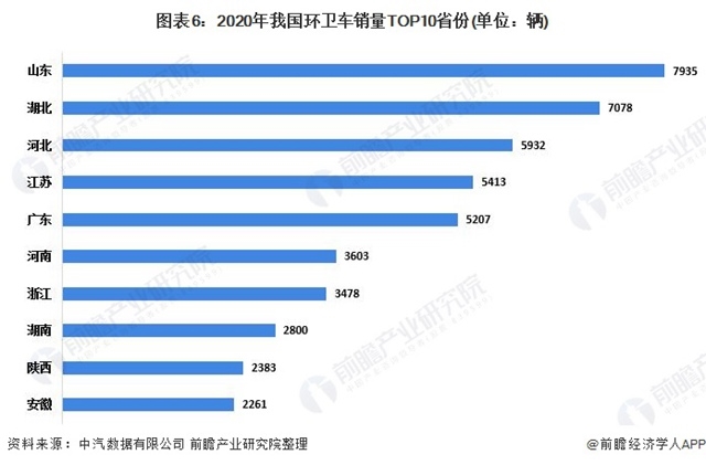 從環(huán)衛(wèi)車需求的區(qū)域分布來看,2020年我國市政環(huán)衛(wèi)車銷量主要分布在中部、東部和南部城市集群相對密集的地區(qū)。2020年我國市政環(huán)衛(wèi)車銷量排名前十的省份地區(qū)分別為山東、湖北、河北、江蘇、廣東、河南、浙江、湖南、陜西和安徽。