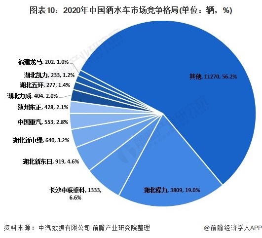 在灑水車市場中,銷量TOP10企業(yè)集中度為43.8%,較2019年同期下滑了16個百分點(diǎn),企業(yè)集中度大幅下滑。其中湖北程力專用汽車有限公司銷量達(dá)到3809輛,市場份額占比為19.0%。