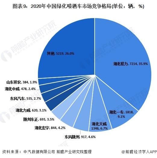 在綠化噴灑車市場中,銷量TOP10企業(yè)集中度為74%,較2019年同期下滑了7.5個百分點(diǎn)。其中湖北程力專用汽車有限公司銷量達(dá)到7214輛,市場份額占比為35.9%,在綠化噴灑車市場中占據(jù)了絕對優(yōu)勢。