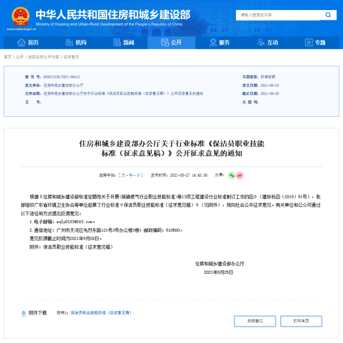 近日,從住房和城鄉(xiāng)建設(shè)部官網(wǎng)獲悉,住房和城鄉(xiāng)建設(shè)部辦公廳正依據(jù)《住房和城鄉(xiāng)建設(shè)部標(biāo)準(zhǔn)定額司關(guān)于開(kāi)展等13項(xiàng)工程建設(shè)行業(yè)標(biāo)準(zhǔn)制訂工作的函》(建標(biāo)標(biāo)函〔2019〕91號(hào)),就《保潔員職業(yè)技能標(biāo)準(zhǔn)》《機(jī)械清掃工職業(yè)技能標(biāo)準(zhǔn)》《垃圾處理工職業(yè)技能標(biāo)準(zhǔn)》等進(jìn)行意見(jiàn)征求。其中,《機(jī)械清掃工職業(yè)技能標(biāo)準(zhǔn)(征求意見(jiàn)稿)》由中國(guó)城市環(huán)境衛(wèi)生協(xié)會(huì)等單位起草,《保潔員職業(yè)技能標(biāo)準(zhǔn)(征求意見(jiàn)稿)》由廣東省環(huán)境衛(wèi)生協(xié)會(huì)等單位起草,《垃圾處理工職業(yè)技能標(biāo)準(zhǔn)(征求意見(jiàn)稿)》由華中科技大學(xué)等單位起草。根據(jù)上述三則征求意見(jiàn)稿的精神,納入三則征求意見(jiàn)稿的環(huán)衛(wèi)工種,其從業(yè)人員有望獲得職業(yè)技能認(rèn)定。下列環(huán)衛(wèi)工種有望獲得職業(yè)技能認(rèn)定納入《保潔員職業(yè)技能標(biāo)準(zhǔn)》征求意見(jiàn)的環(huán)衛(wèi)工種,包括清掃保潔工、公廁保潔員、水域保潔員、高空外墻清洗員;納入《機(jī)械清掃工職業(yè)技能標(biāo)準(zhǔn)》征求意見(jiàn)的環(huán)衛(wèi)工種,包括機(jī)械掃路工、機(jī)械沖洗工、機(jī)械疏通工、機(jī)械除雪工、船舶輪機(jī)工(員);納入《垃圾處理工職業(yè)技能標(biāo)準(zhǔn)》的環(huán)衛(wèi)工種,包括生活垃圾填埋處理工、生活垃圾焚燒處理工、生活垃圾堆肥處理工、廚余垃圾處理工、大件垃圾處理工、園林垃圾處理工、建筑(裝修)垃圾處理工、糞便處理工、垃圾分選工。環(huán)衛(wèi)工種由低到高分為哪些等級(jí)?根據(jù)三則征求意見(jiàn)稿,環(huán)衛(wèi)從業(yè)人員日后或可根據(jù)自己所從事的工作屬性,通過(guò)申報(bào)和考核程序獲得職業(yè)技能等級(jí)評(píng)定,其中:保潔員職業(yè)技能等級(jí)由低到高可分為:職業(yè)技能五級(jí)(初級(jí)工)、職業(yè)技能四級(jí)(中級(jí)工)、職業(yè)技能三級(jí)(高級(jí)工);機(jī)掃工職業(yè)技能等級(jí)由低到高可分為五級(jí):職業(yè)技能五級(jí)(初級(jí)工)、職業(yè)技能四級(jí)(中級(jí)工)、職業(yè)技能三級(jí)(高級(jí)工)、職業(yè)技能二級(jí)(技師)和職業(yè)技能一級(jí)(高級(jí)技師);垃圾處理工職業(yè)技能等級(jí)由低到高可分為:職業(yè)技能五級(jí)、職業(yè)技能四級(jí)、職業(yè)技能三級(jí)、職業(yè)技能二級(jí)和職業(yè)技能一級(jí)。 鼓勵(lì)環(huán)衛(wèi)工人通過(guò)進(jìn)修更高等級(jí)的職業(yè)資格認(rèn)定征求意見(jiàn)稿鼓勵(lì)環(huán)衛(wèi)工人通過(guò)進(jìn)修獲得使用相關(guān)機(jī)械的資質(zhì),或者通過(guò)進(jìn)修提升文化水平獲得更高等級(jí)的職業(yè)資格認(rèn)定。如最高等級(jí)只到三級(jí)的保潔員,可按照環(huán)境衛(wèi)生服務(wù)行業(yè)其他工種的職業(yè)技能要求申報(bào)更高等級(jí);如具有大專(zhuān)及以上本專(zhuān)業(yè)或相關(guān)專(zhuān)業(yè)畢業(yè)證書(shū),并取得本職業(yè)或相關(guān)職業(yè)四級(jí)職業(yè)資格證書(shū)后,累計(jì)從事本職業(yè)或相關(guān)職業(yè)工作2年(含)以上者,可申報(bào)垃圾處理工職業(yè)技能三級(jí);具有大專(zhuān)及以上本專(zhuān)業(yè)或相關(guān)專(zhuān)業(yè)畢業(yè)證書(shū),累積從事本職業(yè)工作1年(含)及以上,可申報(bào)機(jī)掃工職業(yè)技能三級(jí)(高級(jí)工)。據(jù)悉,隨著國(guó)內(nèi)各城市的發(fā)展,不少城市近年來(lái)紛紛鼓勵(lì)環(huán)衛(wèi)工人通過(guò)提升職業(yè)技能,引導(dǎo)環(huán)衛(wèi)工人從單純使用簡(jiǎn)單工具進(jìn)行路面保潔轉(zhuǎn)型為可使用或駕駛各類(lèi)機(jī)械參與更精細(xì)化的保潔工作,也鼓勵(lì)有條件的環(huán)衛(wèi)工人通過(guò)進(jìn)修文化課獲得更高等的學(xué)位轉(zhuǎn)型為管理人員。備注:以上部分內(nèi)容節(jié)選自羊城派《這些環(huán)衛(wèi)工種擬進(jìn)行職業(yè)技能認(rèn)定!未來(lái)更有奔頭》。關(guān)于行業(yè)標(biāo)準(zhǔn)《機(jī)械清掃工職業(yè)技能標(biāo)準(zhǔn)(征求意見(jiàn)稿)》公開(kāi)征求意見(jiàn)的通知根據(jù)《住房和城鄉(xiāng)建設(shè)部標(biāo)準(zhǔn)定額司關(guān)于開(kāi)展<城鎮(zhèn)燃?xì)庑袠I(yè)職業(yè)技能標(biāo)準(zhǔn)>等13項(xiàng)工程建設(shè)行業(yè)標(biāo)準(zhǔn)制訂工作的函》(建標(biāo)標(biāo)函〔2019〕91號(hào)),我部組織中國(guó)城市環(huán)境衛(wèi)生協(xié)會(huì)等單位起草了行業(yè)標(biāo)準(zhǔn)《機(jī)械清掃工職業(yè)技能標(biāo)準(zhǔn)(征求意見(jiàn)稿)》(見(jiàn)附件),現(xiàn)向社會(huì)公開(kāi)征求意見(jiàn)。有關(guān)單位和公眾可通過(guò)以下途徑和方式提出反饋意見(jiàn):1.電子郵箱:zhudx12345@163.com。2.通信地址:湖南省長(zhǎng)沙市岳麓區(qū)麓谷街道麓楓路61號(hào)湘麓國(guó)際小區(qū)2棟;郵政編碼:410205。意見(jiàn)反饋截止時(shí)間為2021年9月26日。附件:機(jī)械清掃工職業(yè)技能標(biāo)準(zhǔn)(征求意見(jiàn)
