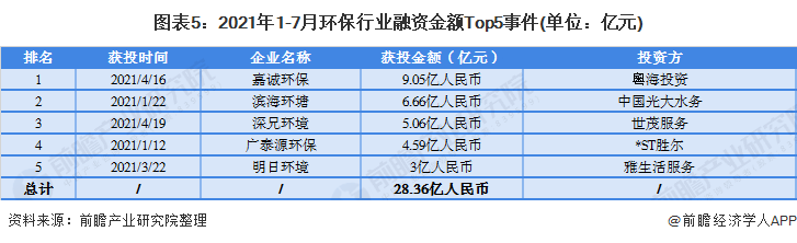2021年1-7月,環(huán)保行業(yè)Top5投融資事件共計(jì)28.36億元,其中獲投金額最多的主人翁為嘉誠環(huán)保,由粵海投資9.05億元。