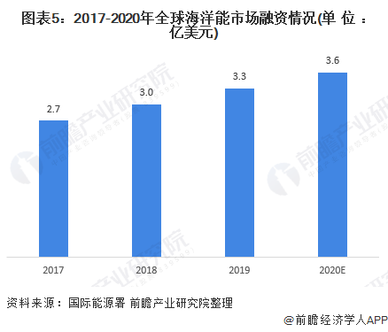 2017-2020年,全球海洋能市場融資規(guī)模逐年上升。其中2020年全球海洋能市場的融資金額達到3.6億美元,相較2019年增長9%。