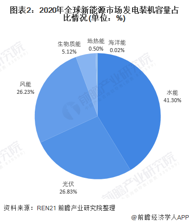 根據2021年6月全球可再生能源平臺REN21正式發(fā)布的《全球可再生能源現狀報告2021》數據顯示,2020年,全球累計裝機容量最大的水能,裝機量達到1170GW,占全球新能源裝機容量的41.30%;而海洋發(fā)電在可再生能源發(fā)電中所占比例最小,僅有0.02%。目前,大多數海洋發(fā)電項目側重于規(guī)模相對較小的示范項目和不到1MW的試點項目。